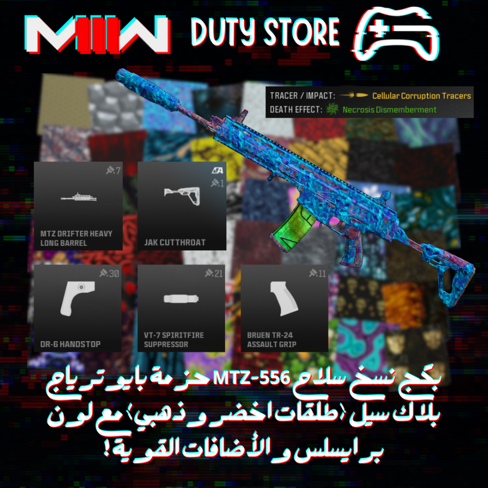 بكج نسخ سلاح MTZ-556 حزمة بايوترياج بلاك سيل (طلقات اخضر وذهبي) مع لون برايسلس والأضافات القوية ! (جميع المنصات)