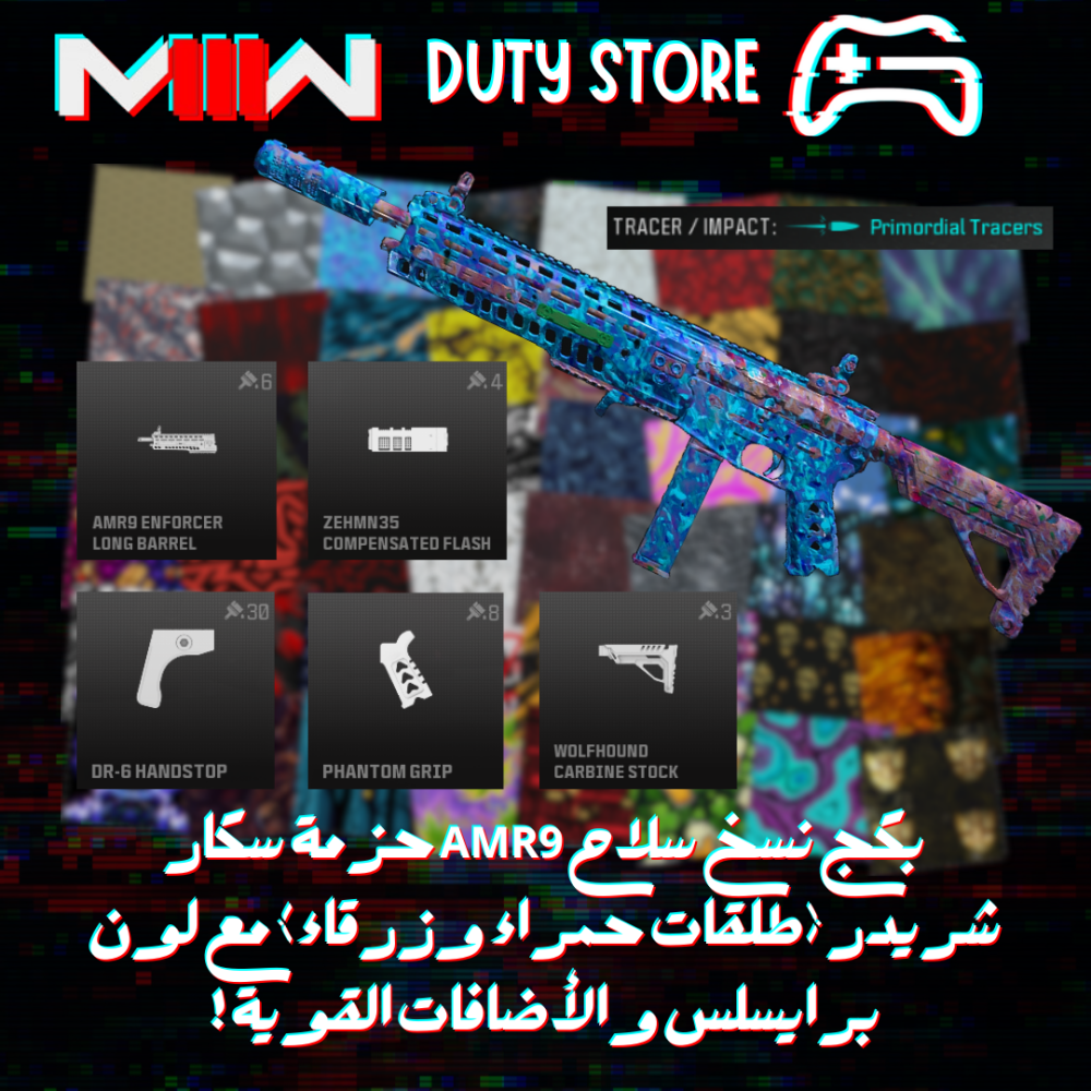 بكج نسخ سلاح AMR9 حزمة سكار شريدر (طلقات حمراء وزرقاء) مع لون برايسلس والأضافات القوية ! (جميع المنصات)