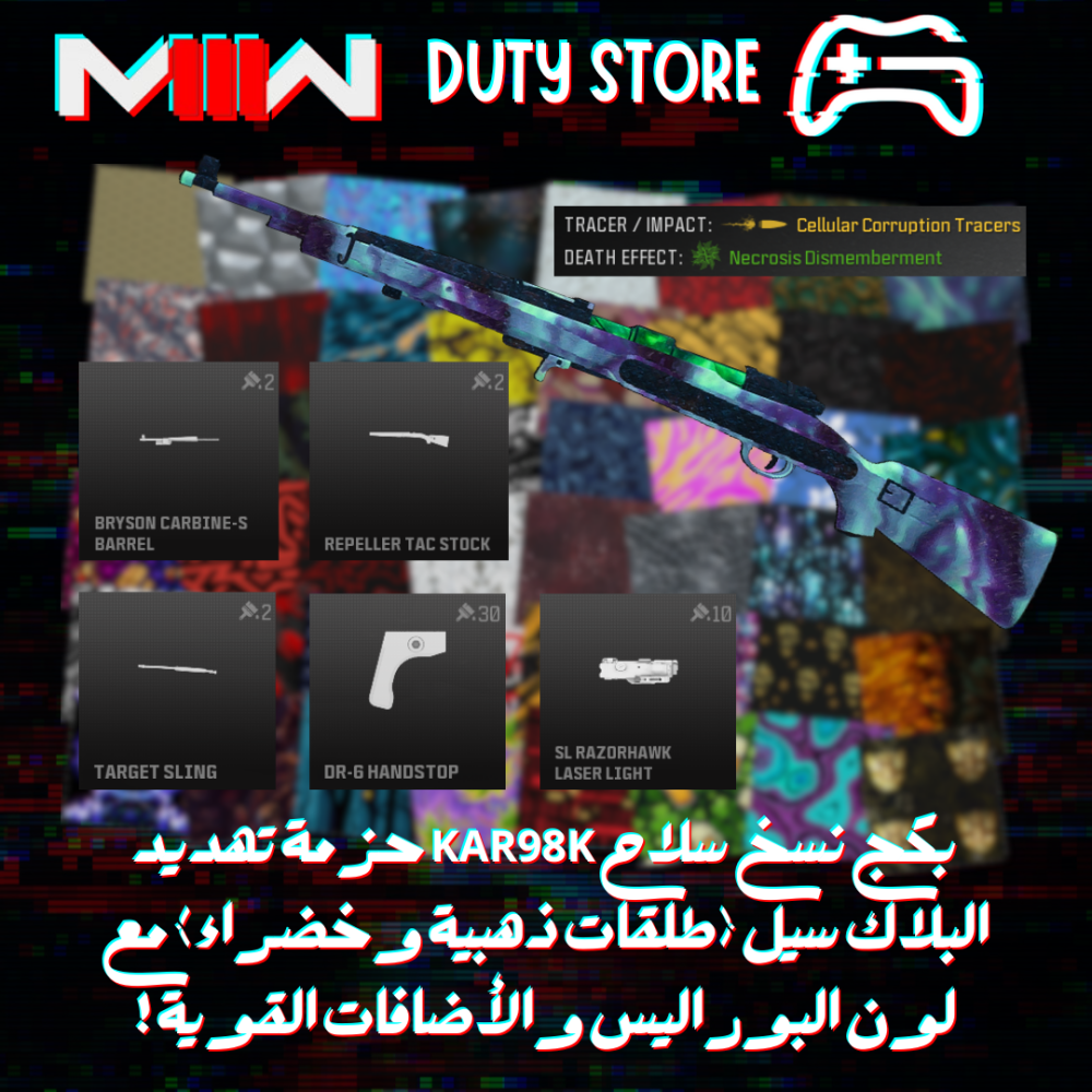 بكج نسخ سلاح KAR98K حزمة تهديد البلاك سيل (طلقات ذهبية وخضراء) مع لون البوراليس والأضافات القوية ! (جميع المنصات)