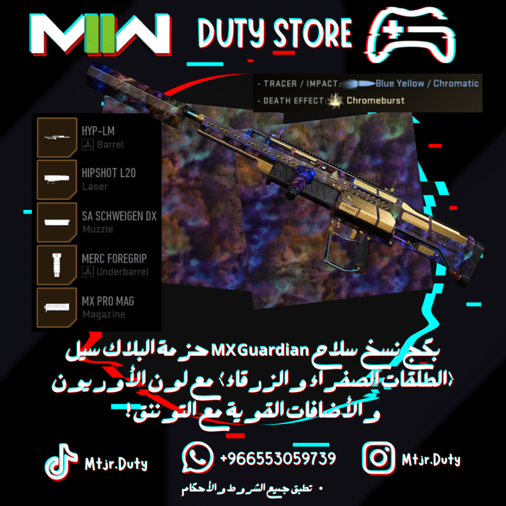 بكج نسخ سلاح MX Guardian حزمة البلاك سيل (الطلقات الصفراء والزرقاء) مع لون الأوريون والأضافات القوية مع التوننق !