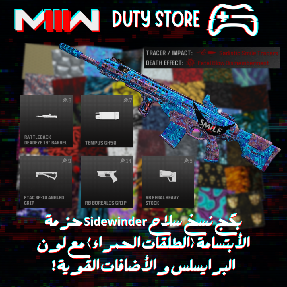 بكج نسخ سلاح Sidewinder حزمة الأبتسامة (الطلقات الحمراء) مع لون البرايسلس والأضافات القوية ! (جميع المنصات)