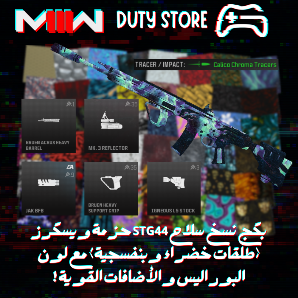 بكج نسخ سلاح STG44 حزمة ويسكرز (طلقات خضراء وبنفسجية) مع لون البوراليس والأضافات القوية ! (جميع المنصات)